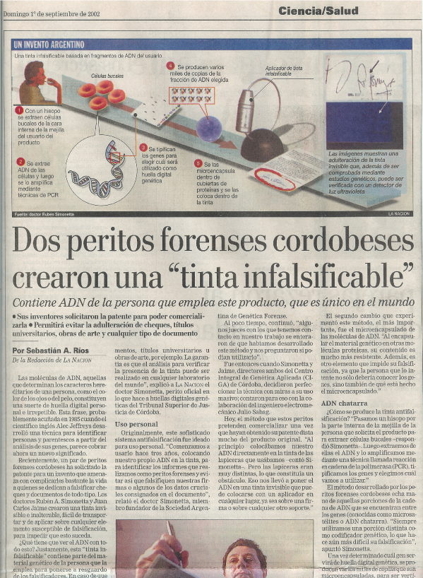 En el año 2001, profesionales de CIGA., desarrollaron una tinta invisible e inalterable, que contiene moléculas encapsuladas del ADN de la persona que la va a utilizar, aplicable sobre cualquier papel o elemento susceptible de ser adulterado.